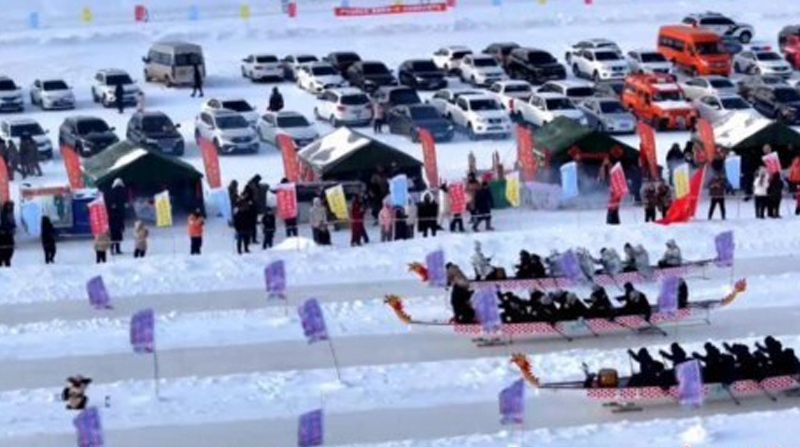 边城呼玛:中俄运动员界江竞技冰上龙舟赛