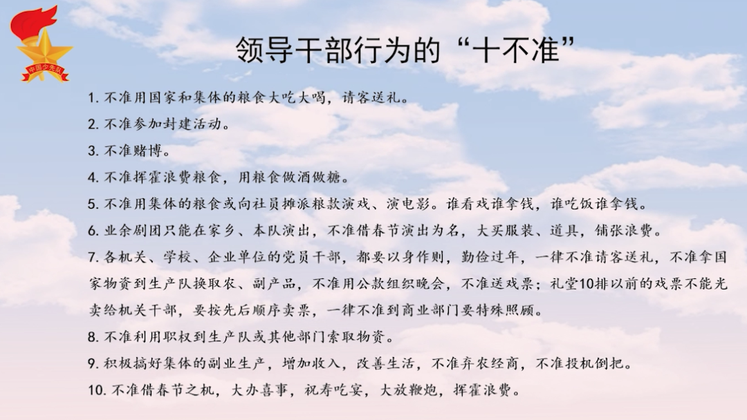 队员们,虽然时代在不断地发展,但是我们依然能从革命前辈的红色家风中汲取到深刻的教育意义,在你们成长的过程当中,希望焦裕禄不搞特殊化的家风,无论在生活上还是学习中,都能够引领你们清清白白做人、干干净净做事,用实际行动服务人民,不断增进与人民的深厚感情,更好地为祖国的建设付出自己的一份力量,为实现伟大复兴的中国梦而奋斗终身!