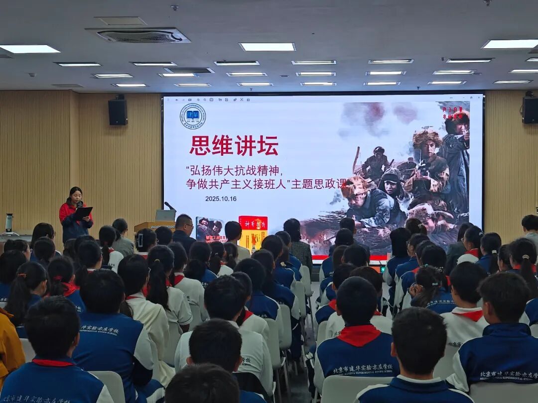 近日,在北京市建华实验亦庄学校多功能厅,百余位师生代表共同聆听了一堂以“弘扬伟大抗战精神,争做共产主义接班人”为主题的思政课。在课上,主讲人中国近现代史史料学学会理事、辽宁作家协会会员李姝讲授了杨靖宇将军和他领导的抗联少年营的抗战传奇故事。