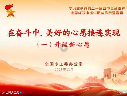 为深入学习宣传贯彻党的二十届四中全会精神,近期,全国少工委办公室组织全国红领巾巡讲团骨干进行了集体备课,并先后前往多地开展宣讲,用“童言童语”讲好党的创新理论。为赋能基层,现推出全会精神示范宣讲稿(少先队员版)及课件,方便少先队辅导员、少先队工作者组织队课、宣讲等活动使用 。