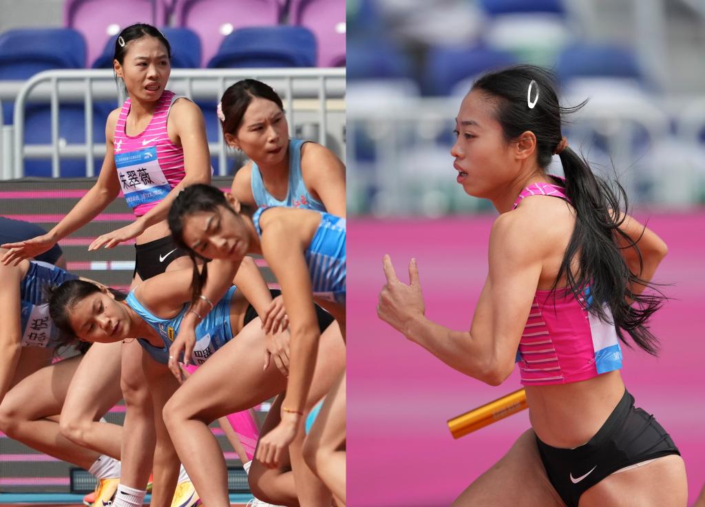 拼版照片:广东队选手朱翠薇(左图)、朱翠妍(右图)在田径女子4X100米接力预赛中。新华社记者 李一博 摄