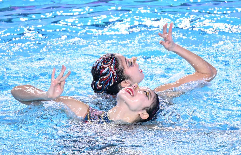 11月15日,广东队组合王柳懿/王芊懿在花样游泳女子双人自由自选比赛中。最终,她们获得女子双人项目冠军。新华社记者 陈钟昊 摄