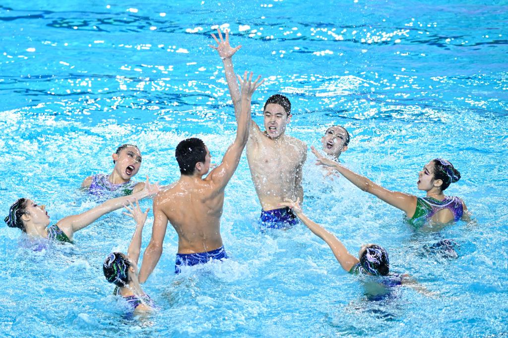 11月14日,北京队选手郭牧兮/郭牧也(男)和队友们在花样游泳集体技巧自选比赛中。新华社记者 陈钟昊 摄