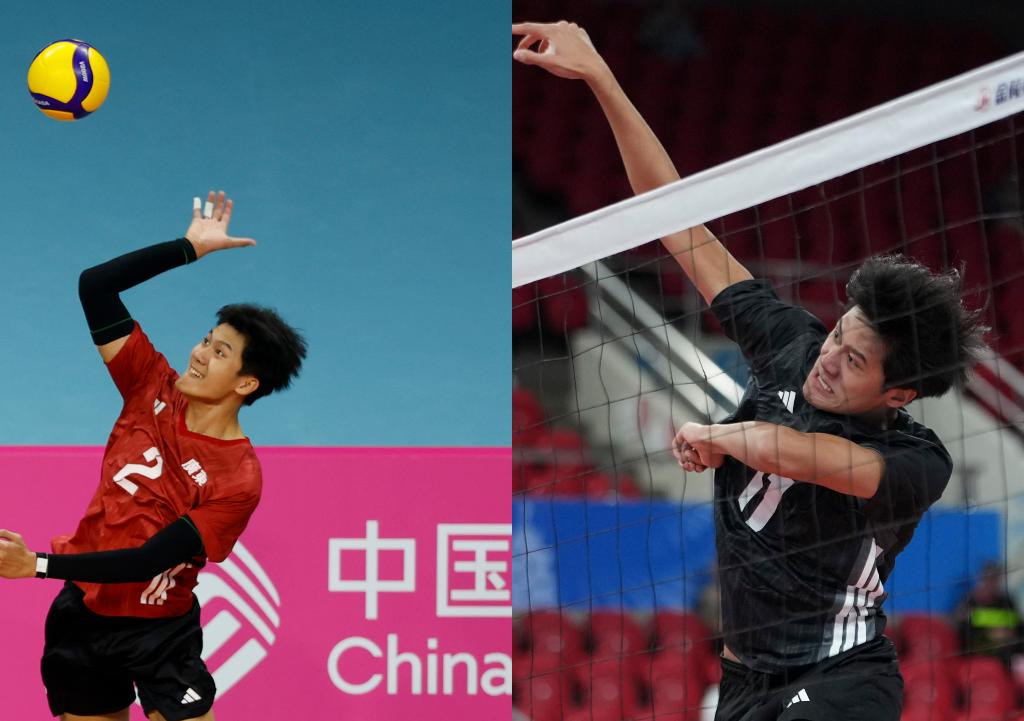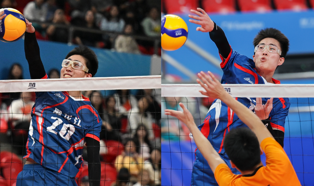 拼版照片:左图为广东队球员朱桂霆在排球男子18岁以下组C组小组赛中进攻(11月14日摄)。新华社记者 黄伟 摄;右图为广东队球员朱桂毅在排球男子18岁以下组小组赛A组比赛中进攻(11月11日摄)。新华社记者 李一博 摄