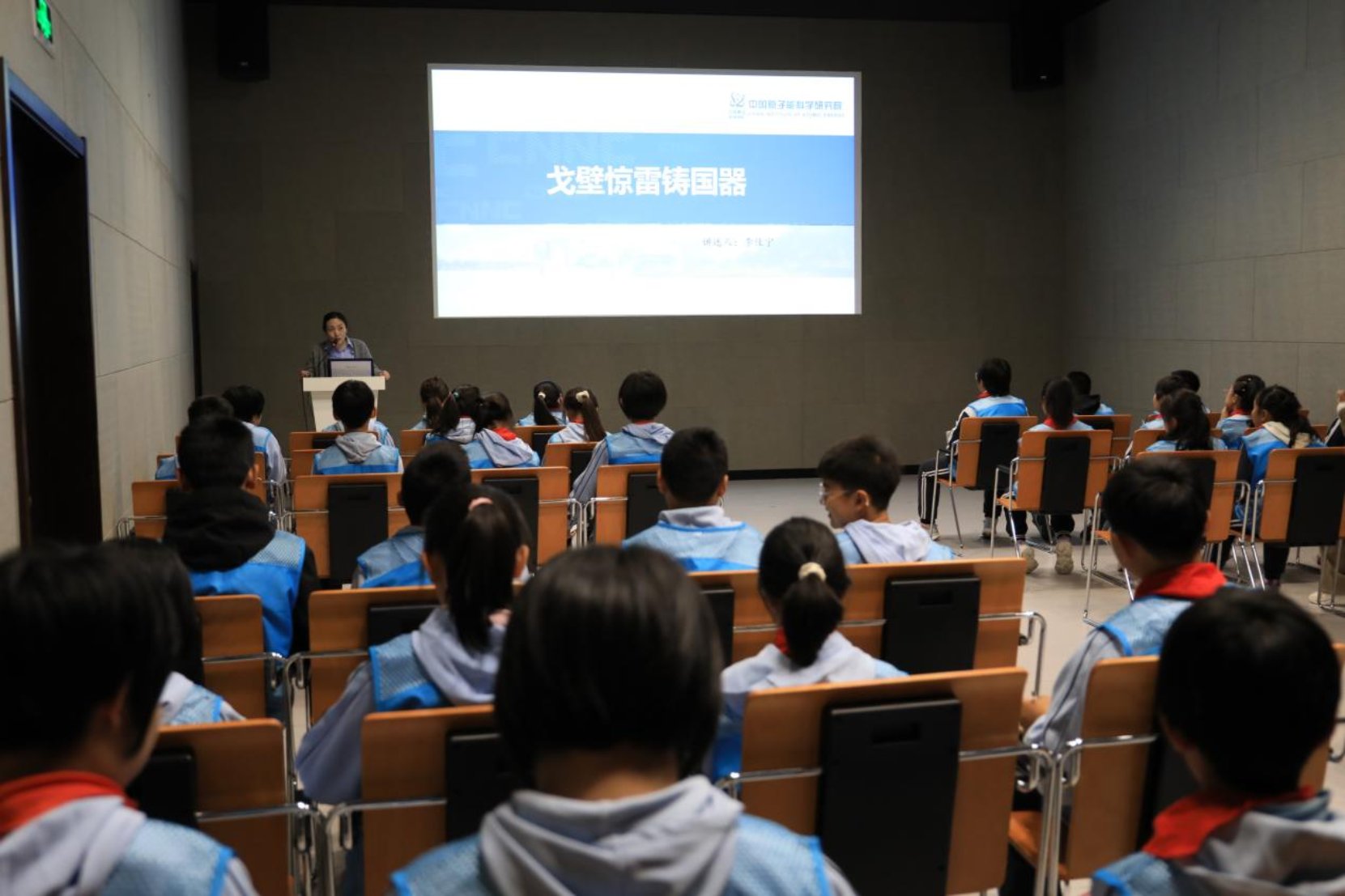 在悠扬的音乐声中,中国原子能科学研究院的李老师为大家娓娓道来钱三强、王淦昌、邓稼先等三位功勋科学家的故事。“为了保守国家机密,他三次与诺贝尔奖擦肩而过;在功成名就时,他‘失踪’了近20年;直到1978年,他才告别‘王京’的身份,重新回到大众视野……他,就是王淦昌。”“美国政府想用优越的科研和生活条件,把这位天才留在美国。老师和同学也纷纷挽留,但邓稼先拒绝了所有人,一心只想回到大洋彼岸的祖国,回到热爱的故土。”在一个个生动的故事中,小记者们仿佛被带回了当时的岁月,在国之脊梁“干惊天动地事,做隐姓埋名人”的经历中,见证了新中国核事业从起步到发展的峥嵘岁月,为核工业人“甘坐冷板凳、勇闯无人区”的担当所动容。