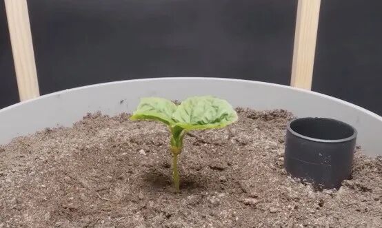 在春天,农民伯伯把黑色的苦瓜种子种在温暖的土壤里。经过5~10天的地下“闭关修炼”后,两片嫩绿的小叶子就会像好奇宝宝一样,突然从土里探出小脑袋。