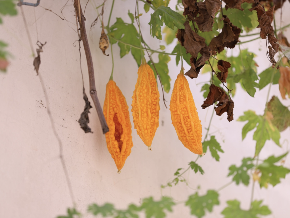 成熟的苦瓜穿着绿色的“外套”,表面布满凹凸不平的疙瘩。如果不及时采摘,苦瓜会渐渐变成橙黄色,最后开裂,露出包裹在里面有着红色假种皮的种子,这可是许多小鸟的最爱!