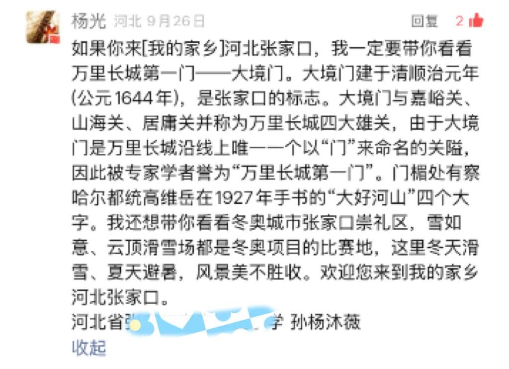 如果你来我的家乡河北张家口,我一定要带你看看万里长城第一门——大境门。大境门建于清顺治元年(公元1644年),是张家口的标志。大境门与嘉峪关、山海关、居庸关并称为万里长城四大雄关,由于大境门是万里长城沿线上唯一一个以“门”来命名的关隘,因此被誉为“万里长城第一门”。门楣处有时任察哈尔都统高维岳在1927年手书的“大好河山”四个大字。我还想带你看看冬奥城市张家口的崇礼区,雪如意、云顶滑雪场都是冬奥项目的比赛地。这里冬天滑雪、夏天避暑,风景美不胜收。欢迎您来到我的家乡河北张家口。