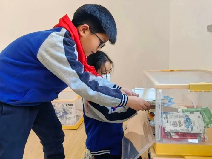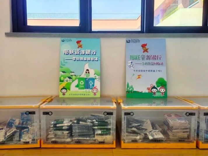 一直以来,笕文实验学校坚持与杭州市少先队资源银行开展合作,共同推进废旧牛奶纸盒的回收工作。在班级里,学生们每天下午喝完牛奶后,会自行对牛奶纸盒进行清理,之后以班级为单位统一回收。这些回收的牛奶纸盒会被送往杭州市少先队资源银行,由他们进行再加工处理,制成铅笔、本子等文具,然后再回赠给学校。后续,这些由回收材料制成的文具还会被放置在彤跃爱心驿站,供更多有需要的孩子使用,让公益的温暖渗透到学生生活的每一个角落。