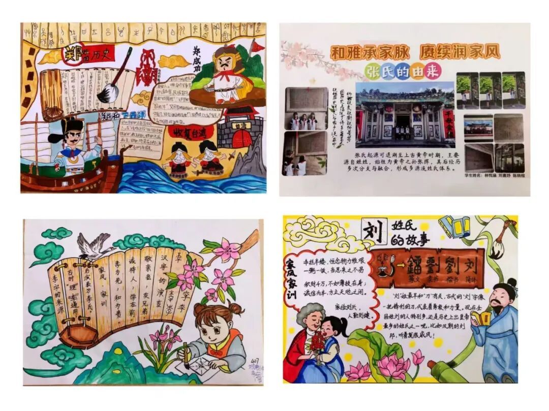 “我是谁?我从哪里来?”这是每个人都会思考的问题。“和雅章”环节中,寻找姓氏文化根源活动引导孩子们探索家族历史,了解姓氏渊源。孩子们通过查阅家谱、询问长辈、搜集资料等方式,追溯自己的姓氏起源和家族迁徙史,并制作成精美的家谱图。这项活动不仅增进了孩子们对家族和文化的认同感,更在潜移默化中厚植家国情怀。