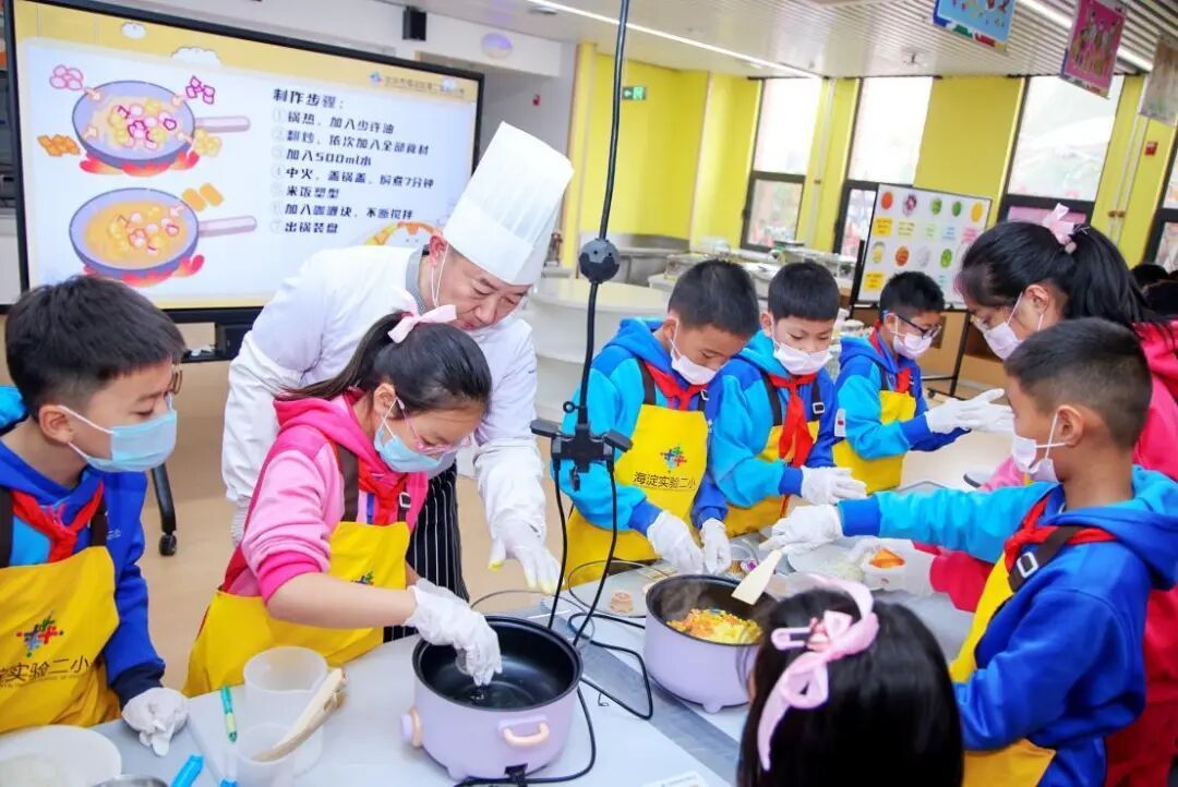 “我是小小营养师”课程:孩子们戴上小围裙,动手制作简单又营养的均衡美食,体验从食材到成品的全过程,感受劳动与分享的快乐。值得一提的是这节课在学校崭新的“食育空间”里举行,海淀实验二小的郭红霞校长介绍未来学校将陆续推动“幸福+”七大主题“食育课程”。