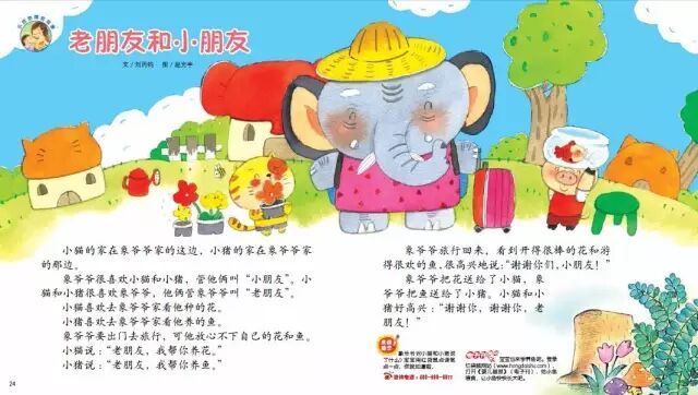 象爷爷很喜欢小猫和小猪,管他俩叫“小朋友”。小猫和小猪很喜欢象爷爷,他俩管象爷爷叫“老朋友”。