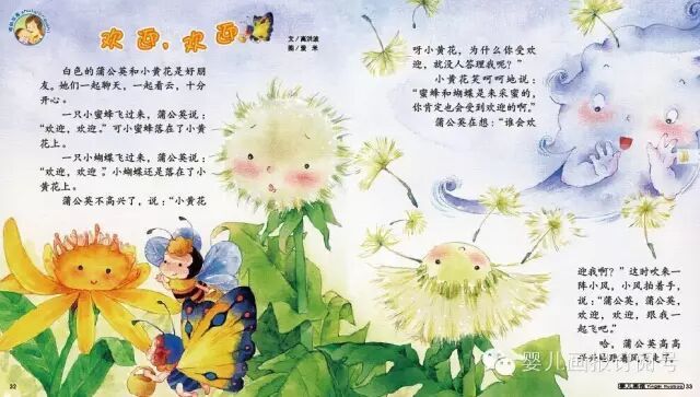 一只小蝴蝶飞过来,蒲公英说:“欢迎,欢迎。”可小蝴蝶还是落在了小黄花上。