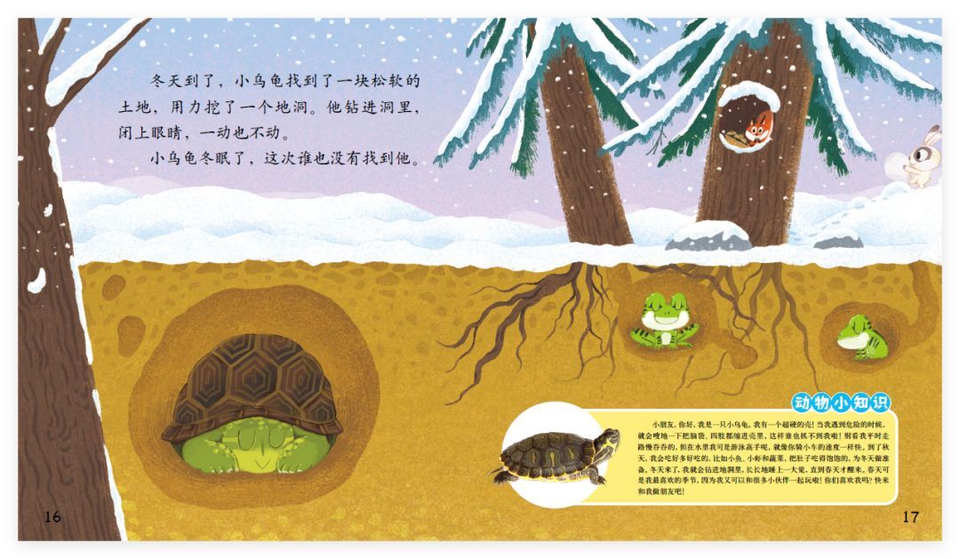 冬天到了,小乌龟找到了一块松软的土地,用力挖了一个地洞。他钻进洞里,闭上眼睛,一动也不动。