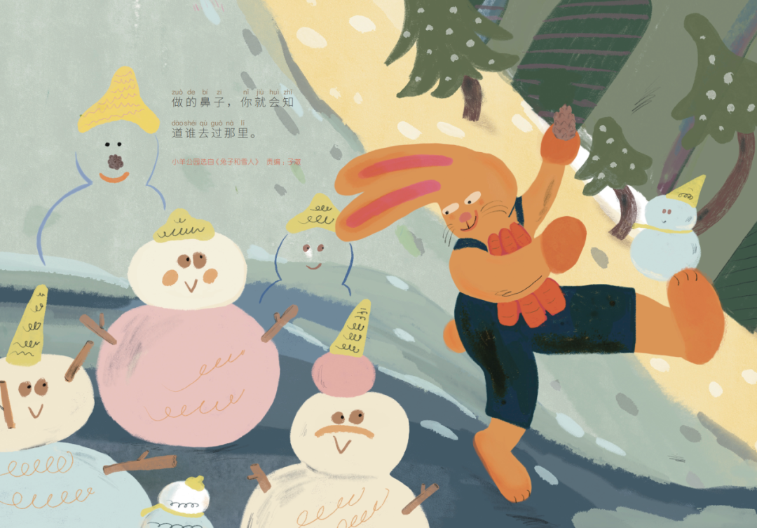 《兔子和雪人》:一个下雪天,免爸爸让贺拉斯出门去给大家找点食物回来。贺拉斯遇到了一个高大的白色生物,它腆着胖乎乎、圆滚滚的大肚子,树枝胳膊瘦瘦的,脸上还咧开了一个大大的、友好的微笑。这个白色生物是谁呢?