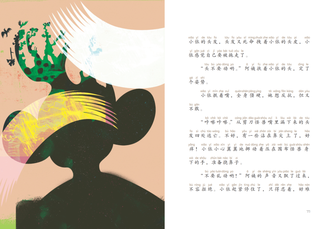 《理发好可怕》:小依不愿进理发店,因为理发店好可怕。围布怪兽、剪刀怪兽、梳子怪兽结伴而来,电推子怪兽刚走,吹风机怪兽又来了……