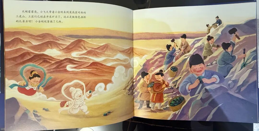 “我们不想把敦煌文化做得太厚重、让孩子觉得难接触。”姜楠直言,团队始终坚持“小切口、大背景”的创作理念。在《看得见的敦煌·多彩的旅程》中,孩子跟着小金刚的脚步,既能读到有趣的冒险故事,又能悄悄get敦煌壁画颜料的来源与绘制过程——比如知道哪些色彩来自西域的矿物,了解画师如何将原料制成颜料。这种“寓教于乐”的方式,让科普不再枯燥,也让孩子对敦煌多了一份亲切感。除了“颜色”,已出版的绘本还聚焦敦煌的音乐、美食等主题,用孩子熟悉的元素串联敦煌历史与风土人情。