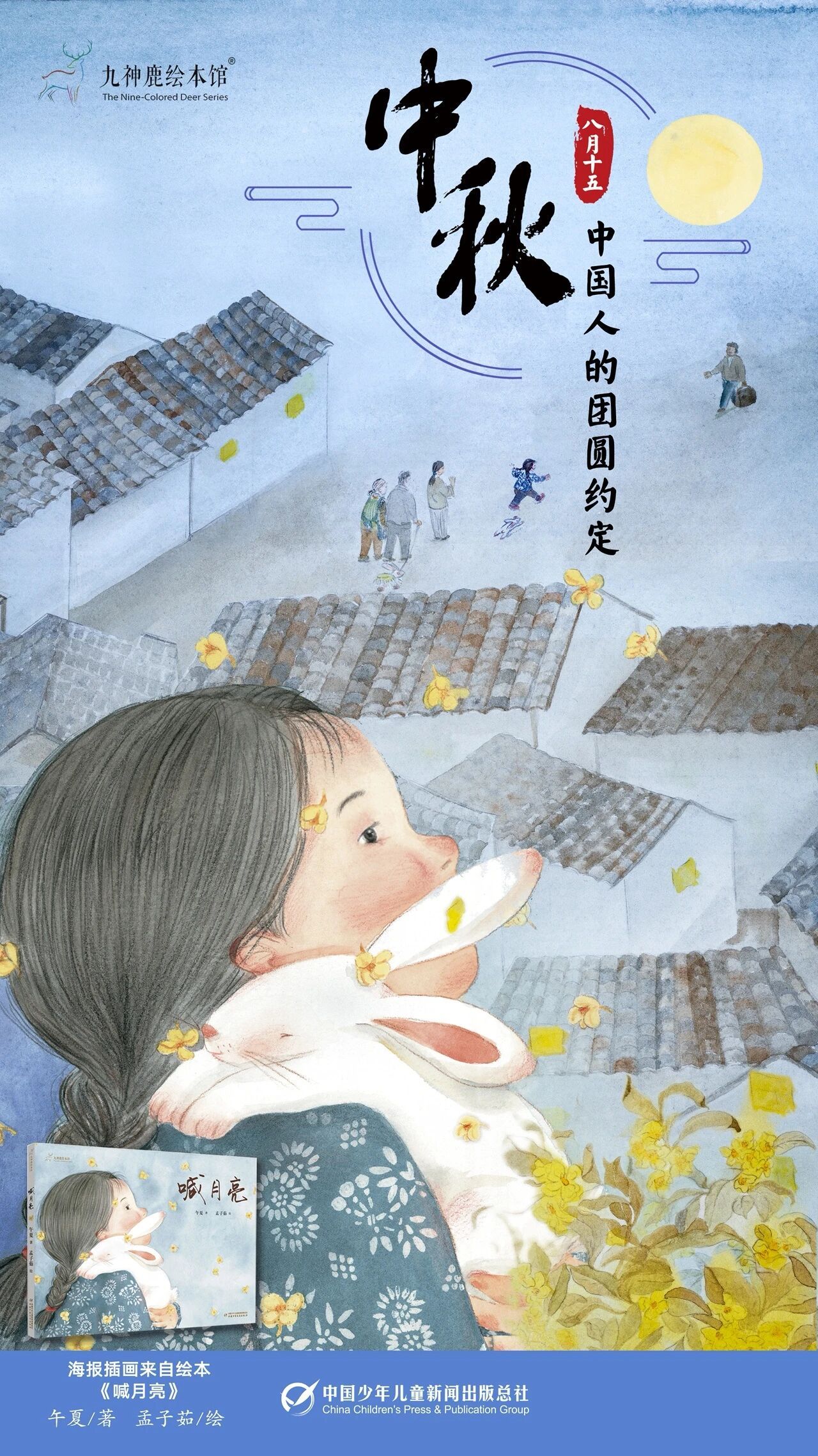 《喊月亮》是一个以中国传统节日中秋节为背景的故事,故事的主角是在中秋夜盼着爸爸回家的小女孩月月。月月一家生活在南方的农村,她和在外工作的爸爸有个“月圆之约”——爸爸承诺在“月亮最圆的那天”回家。所以在月月眼里,思念就像月亮那样又美又圆。可是,“夜空里起了风,月亮躲到云层的后面”,月月跑到小山上喊月亮。爸爸最后回来了,不是因为月亮从云层后面出来了,而是他把月亮(和月月)一直放在心里。