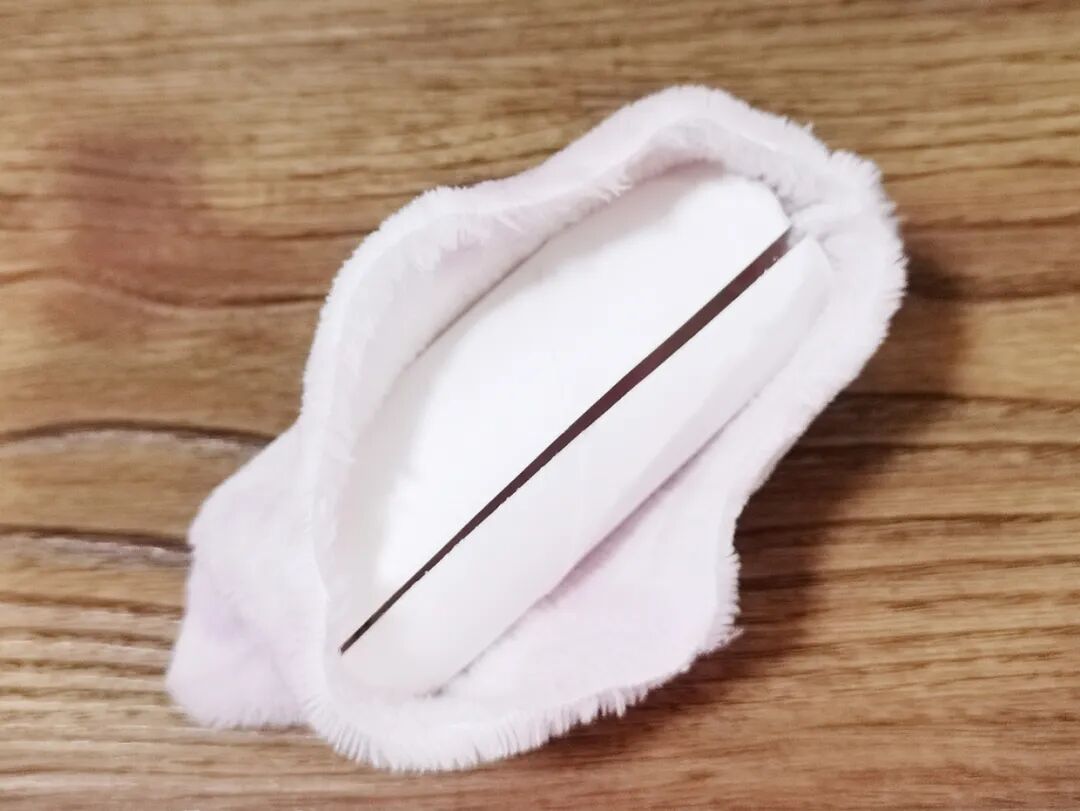 如图,将卷纸芯的另外一面完全剪开后,放进布料内,给它穿上一件“衣服”。