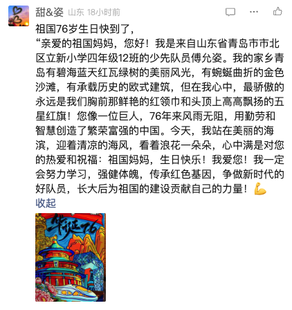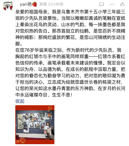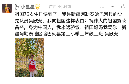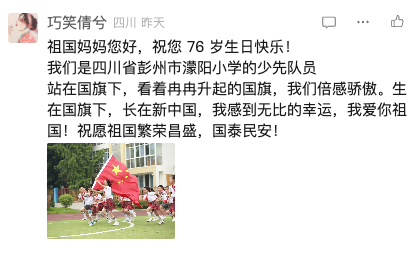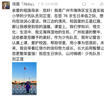 在您 76 岁生日来临之际,我想向您说说心里话。珠江边的清风、校园里的五星红旗,都让我感受到您的温暖。课堂上,我们学知识、悟文化;生活中,我看见海珠湿地的生机、广州街道的繁华。这些都是您赠予的美好......未来,我会带着红领巾的信仰努力成长,长大后用智慧让您更加繁荣富强!祝您生日快乐,山河锦绣!