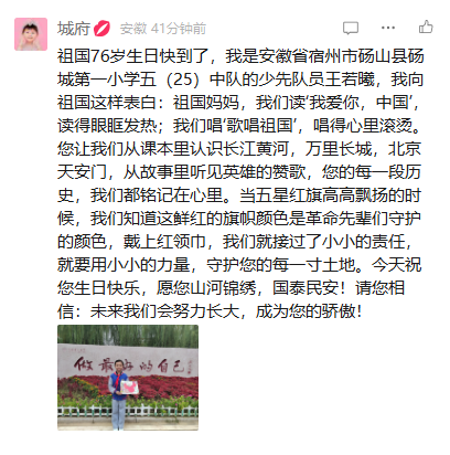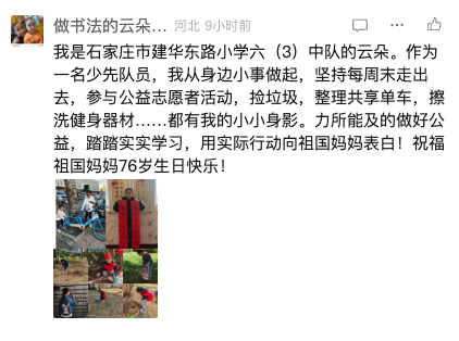 作为一名少先队员,我从身边小事做起,坚持每周末走出去,参与公益志愿者活动,捡垃圾,整理共享单车,擦洗健身器材……都有我的小小身影。我力所能及地做好公益,踏踏实实学习,用实际行动向祖国妈妈表白!祝福祖国妈妈76岁生日快乐!