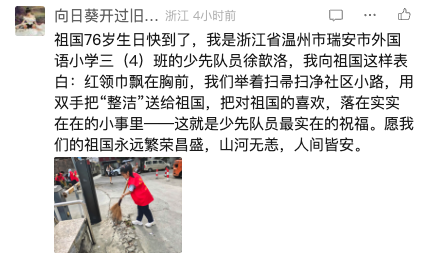 红领巾飘在胸前,我们举着扫帚扫净社区小路,用双手把“整洁”送给祖国,把对祖国的喜欢,落在实实在在的小事里——这就是少先队员最实在的祝福。愿我们的祖国永远繁荣昌盛,山河无恙,人间皆安。