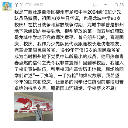祖国76岁生日华诞,也是龙城中学90岁校庆!在抗日战争和解放战争时期,龙城中学曾是柳州地下党组织的重要驻地......我加入了校史宣讲队伍,利用校园内革命历史地标,现场给同学们讲述“一手执笔、一手持枪”的烽火故事。我希望让更多的同学记住黎明前那段艰苦卓绝的抗争岁月,愿祖国山河锦绣、学校薪火不息!