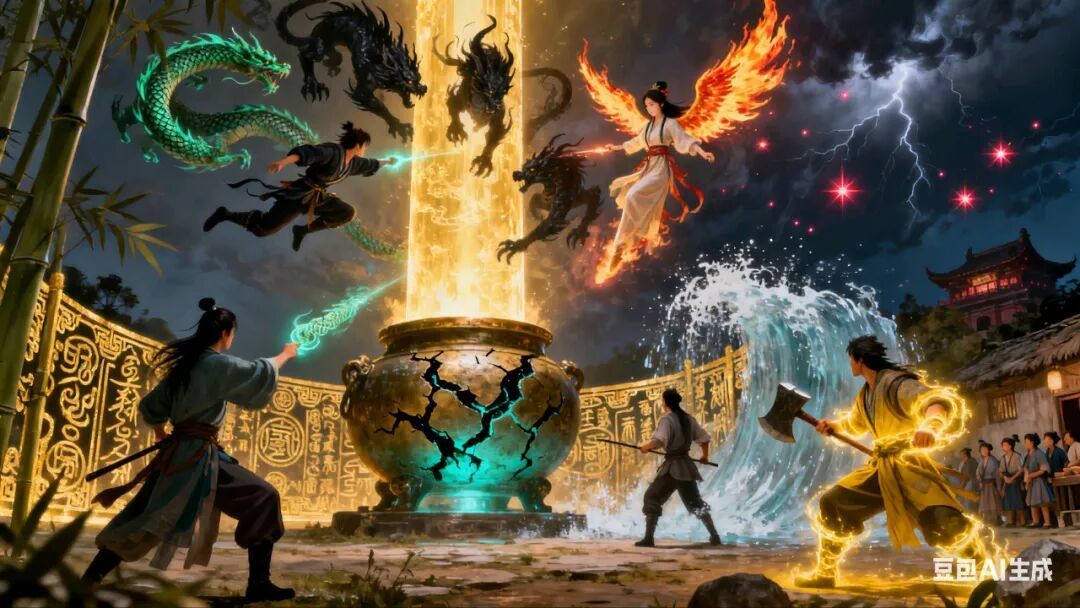 灵溪赶忙振翅升空,火焰般的羽翼“唰”地展开,挡在半空;阿森立刻引动山间溪流,溪水化作层层水幕,稳稳护在村民身后;白虎少年石烈握紧腰间石斧,周身腾起黄色光晕,一步跨到村落入口,死死守住;手持乾坤笔的墨言挥毫疾书,一道道金色符文从笔尖飞出,织成细密的防护屏障。