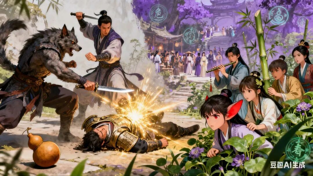 刚飞出山尖,一扇光门“哗啦”打开,一个白头发、胡子拖到地上的老头堵在门口。因九行把小孩往身后一护,拳头“呼”地抡出阵风——是套“云舞拳”,拳风裹着花瓣往对方砸!打了几下,他又指着对方喊:“我是李三叔!你少来我地盘捣乱!”