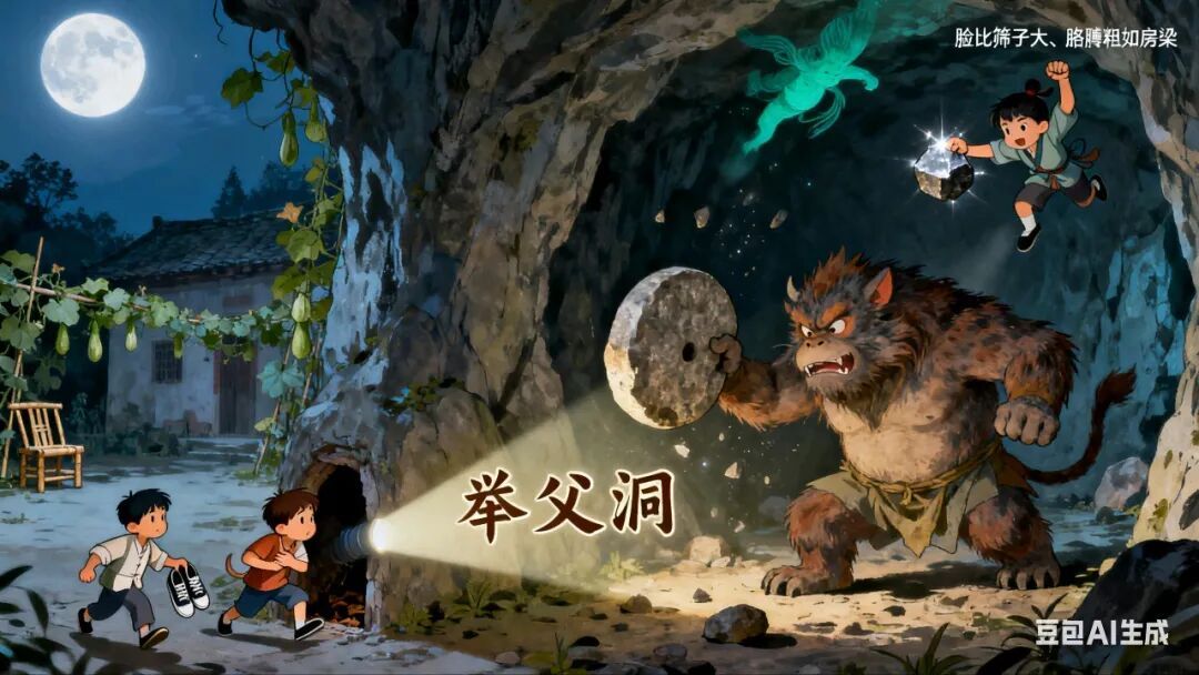 石头带着风声飞过来,张李腿都软了——可就在这时候,一道青影子“嗖”地从洞顶落下来,手里攥着块闪着光的铁块,“当啷”一声就把石头砸了个粉碎!没等兄弟俩反应过来,青影子一把夹起他俩,像拎着两只兔子似的往洞外窜。