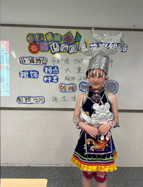 小作者穿上苗族服饰,再加上板书和视频,给大家介绍苗族服饰的特点和文化。介绍形式丰富多样,给大家留下较深的印象。