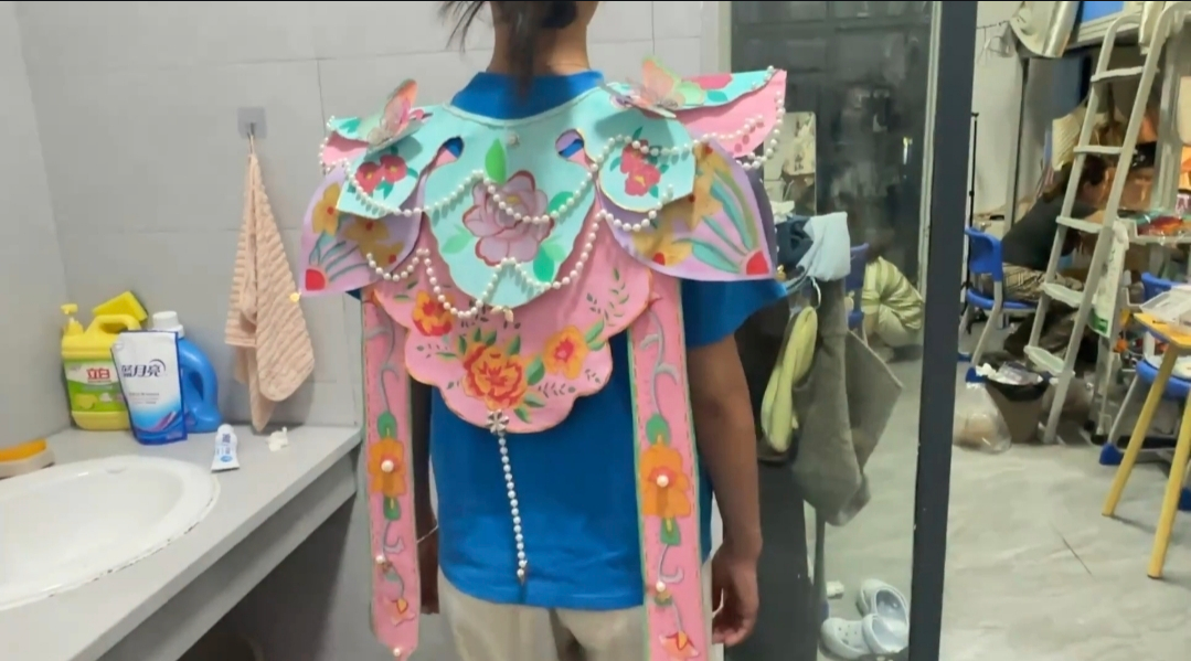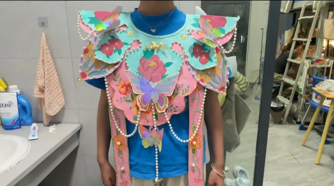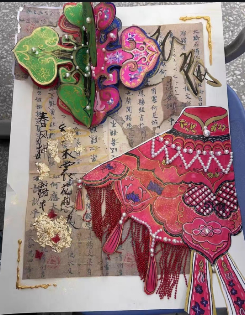 小作者不仅设计了云肩卡片,还利用纸板、珠子等物料裁剪制作了一件漂亮的云肩。作品完成度很高,很漂亮!