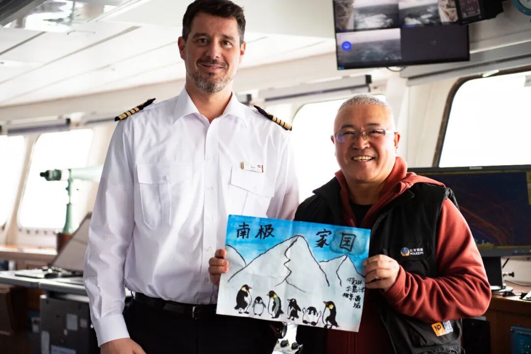 10月23日,海神号船长Nino RADIC(尼诺·拉迪奇)先生(左)祝贺何曼琳作品《南极家园》在南极亮相。马里奥 摄