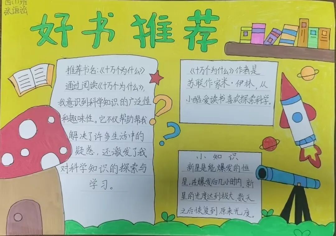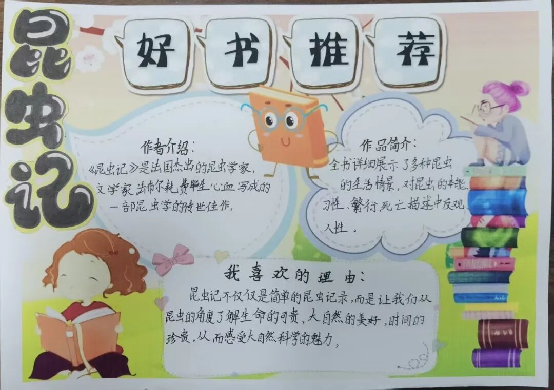 四年级学子的好书推荐卡各有巧思:思维导图清晰梳理书籍脉络,精彩插画搭配推荐语直观鲜活,“推荐理由+精彩语录+阅读收获”的维度解析条理分明。真诚分享中,一本本好书如星火传递,点燃更多同学的阅读热情。