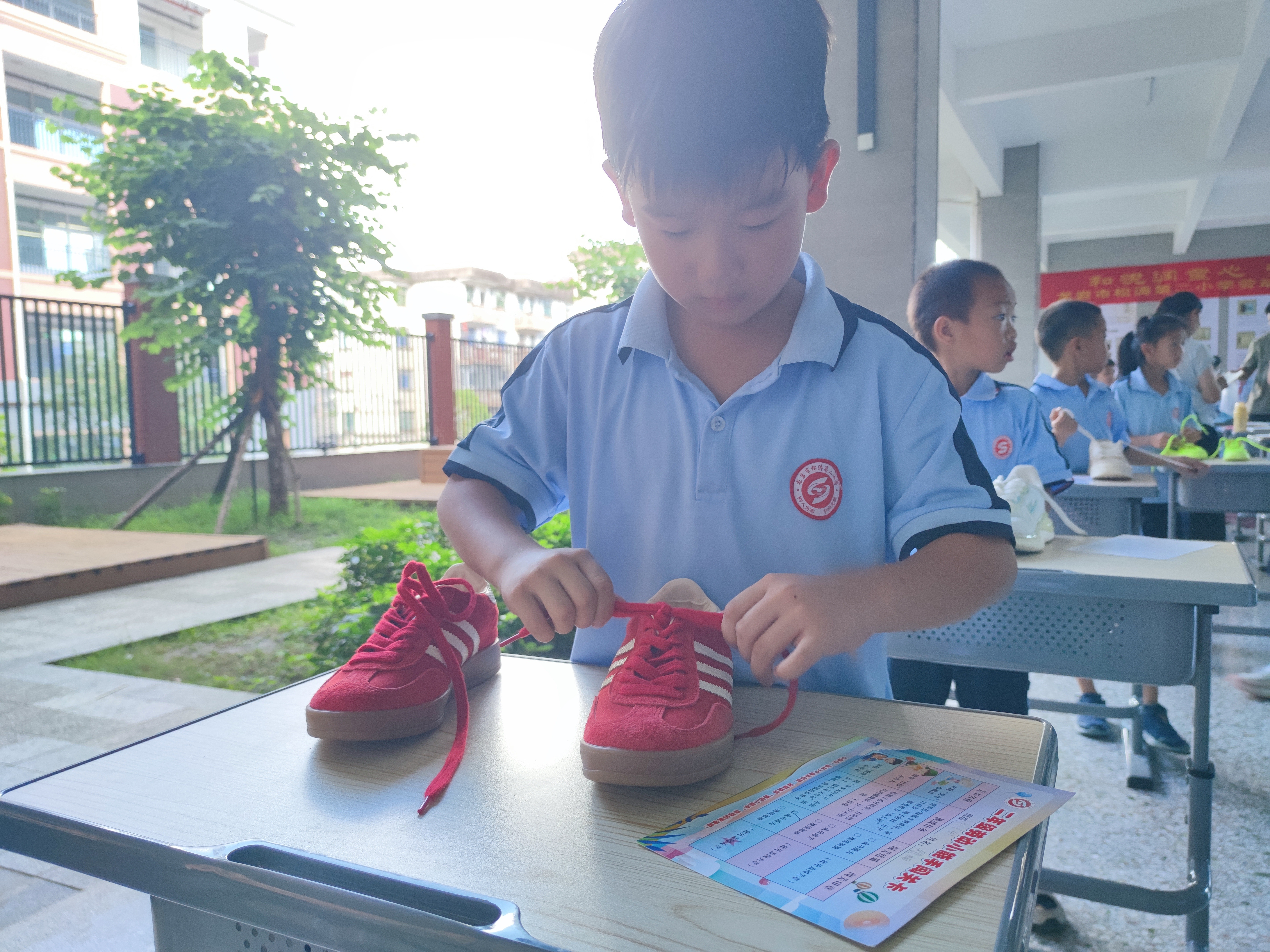 瞧,活动中,二年级学生参与衣物整理、鞋带系结、书包归位三大关卡比拼,在实操中提升生活技能。叠校服时,孩子们目不转睛地对齐领口、抚平褶皱,认真将校服叠得方方正正。系鞋带环节,小小的手指灵活穿梭,不一会儿,一个个牢固又整齐的蝴蝶结便出现在鞋面上。整理书包时,大家牢记“大书在下、小书在上、最后放文具盒”的规则,快速将凌乱的书本、文具分类归位,动作利落又有序。