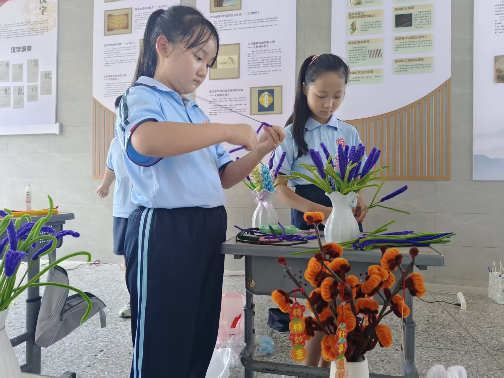 评委依据完成时间与质量评选“劳动小能手”,激发学生参与热情。四、五年级学生通过扭扭棒编织演示、创意作品陈列及绳线编织互动,展现动手与创新能力。