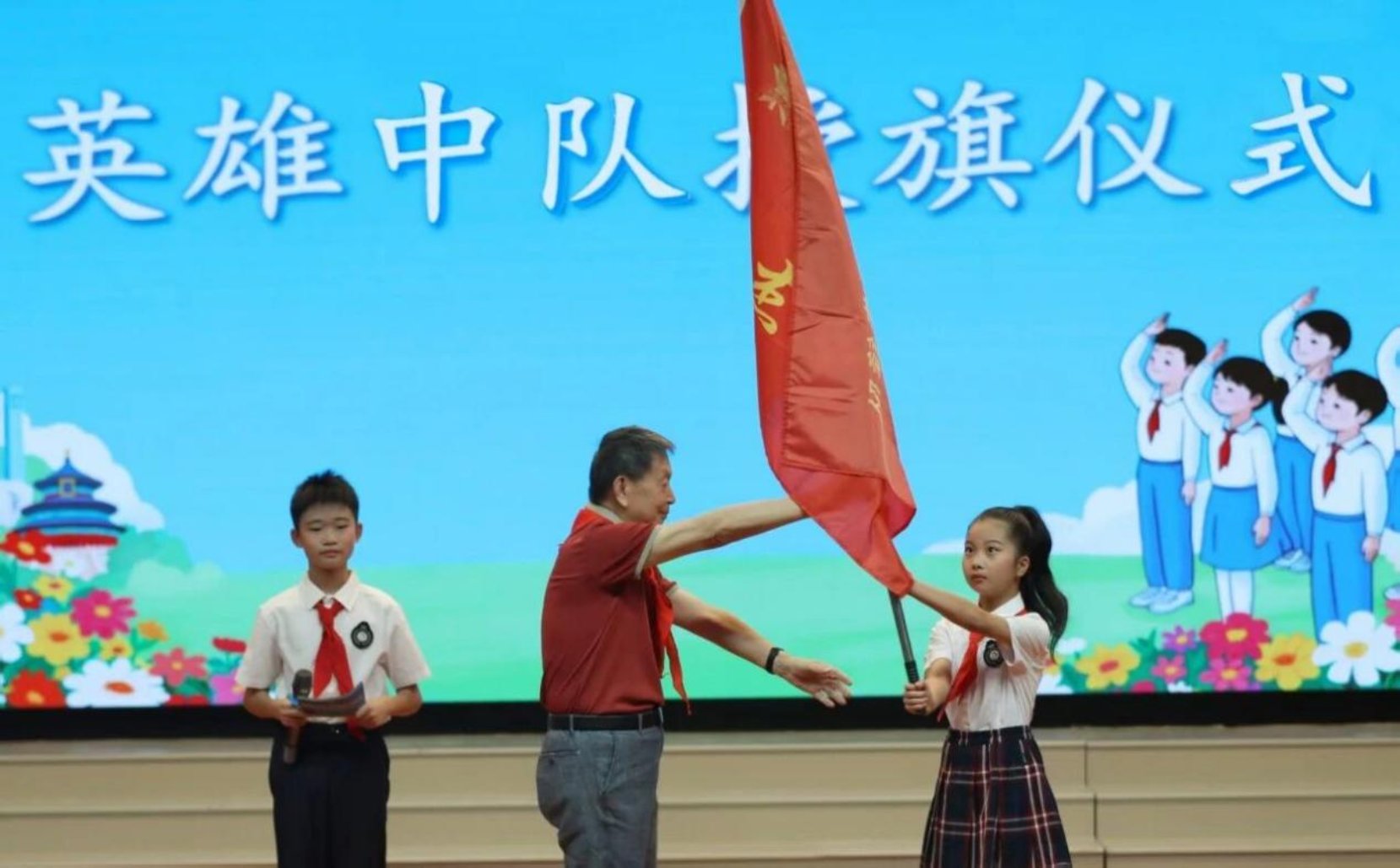 现场,该校已有的5支英雄中队旗帜与来自全国的30面英雄战旗交相辉映,来自各省的8所英雄中队学校代表互赠象征精神传承的礼物。