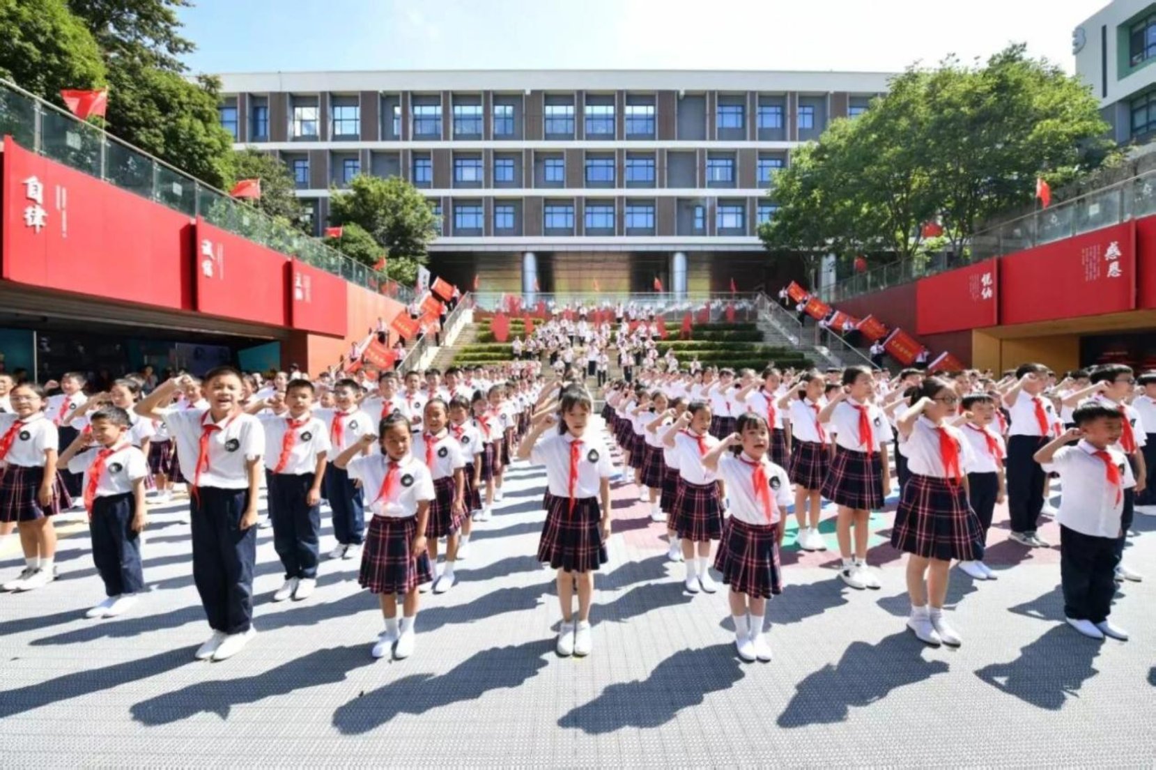 活动尾声,261名新队员在英雄旗帜指引下于学校先锋广场参加入队仪式。老队员为他们佩戴红领巾,宁波艺术实验学校教育集团党委书记陈伟忠领读誓词,宁波市新四军历史研究会会长王建社寄语少年,雷锋生前部队教育顾问、93岁高龄的王芳奶奶带领呼号,新队员们齐呼“时刻准备着”表达自豪与决心。