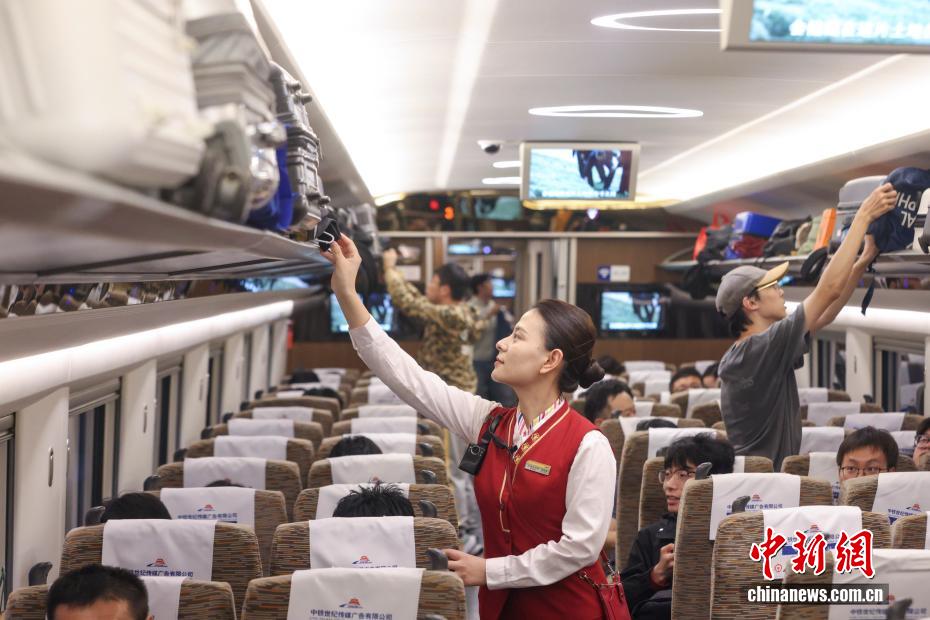 9月30日,G211次列车在北京南站发车前,乘务员在满员的车厢内整理行李架。据中国国家铁路集团有限公司发布消息显示:9月30日,铁路迎来国庆中秋假期客流高峰,全国铁路预计发送旅客1840万人次,计划加开旅客列车2002列。