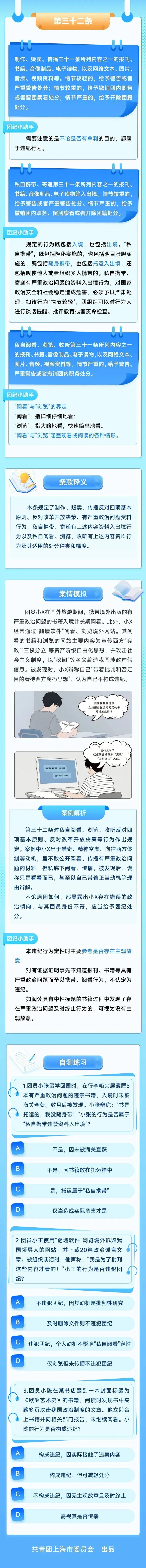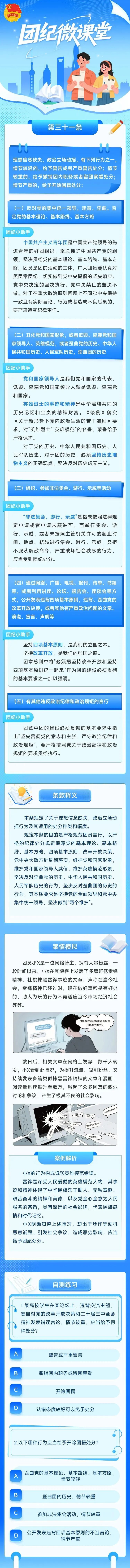 为帮助广大团员深入理解新修订的《中国共产主义青年团纪律处分条例(试行)》(以下简称《条例》),做到学纪、知纪、明纪、守纪,团上海市委组织编写了《团纪微课堂》学习手册,详细介绍《条例》第四章“对违反纪律行为的处分”,帮助团员更好理解各类违反纪律的具体行为及其适用的处分种类和幅度。手册以长图连载形式推送,第一期推出《条例》第三十一、三十二条学习内容。