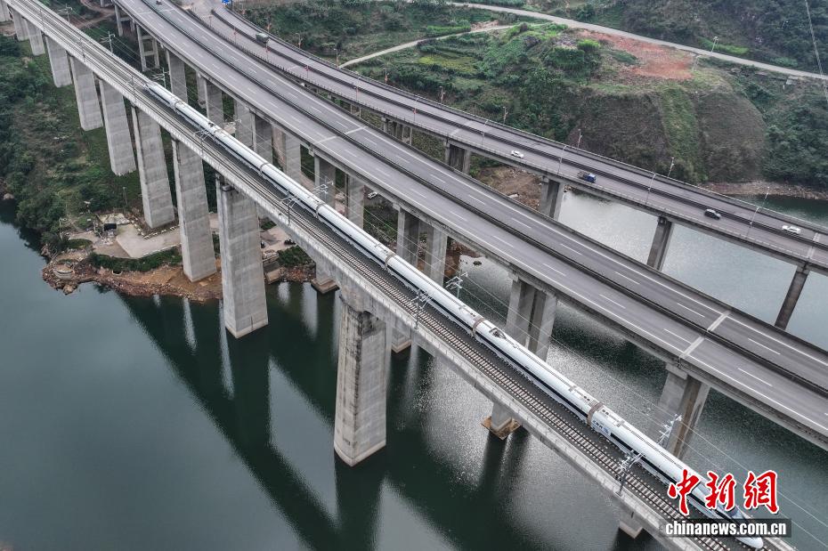 11月20日,贵州省兴义市,55933次运行试验列车行驶在盘兴高铁清水河镇特大桥上。贵州盘州至兴义高速铁路(盘兴高铁)全长约99公里,设计时速250公里,自沪昆客专盘州站引出,经盘州市石桥镇、响水镇、保田镇进入黔西南州兴义市,是贵州省“市市通高铁”的最后一个项目。盘兴高铁共设车站3座,其中改建盘州站,新建保田站、兴义南站。该高铁将于2025年11月底通车,通车后贵阳至贵州省内8个市(州)中心城市将形成1至2小时高铁交通圈。(无人机照片)