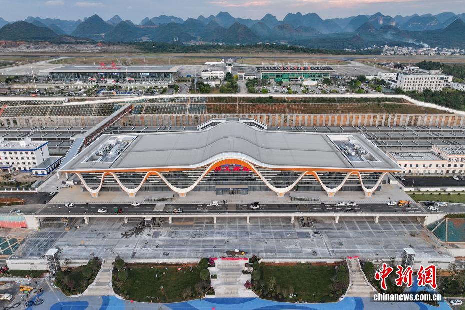 11月19日,航拍位于贵州省兴义市的兴义南站。贵州盘州至兴义高速铁路(盘兴高铁)全长约99公里,设计时速250公里,自沪昆客专盘州站引出,经盘州市石桥镇、响水镇、保田镇进入黔西南州兴义市,是贵州省“市市通高铁”的最后一个项目。盘兴高铁共设车站3座,其中改建盘州站,新建保田站、兴义南站。该高铁将于2025年11月底通车,通车后贵阳至贵州省内8个市(州)中心城市将形成1至2小时高铁交通圈。(无人机照片)