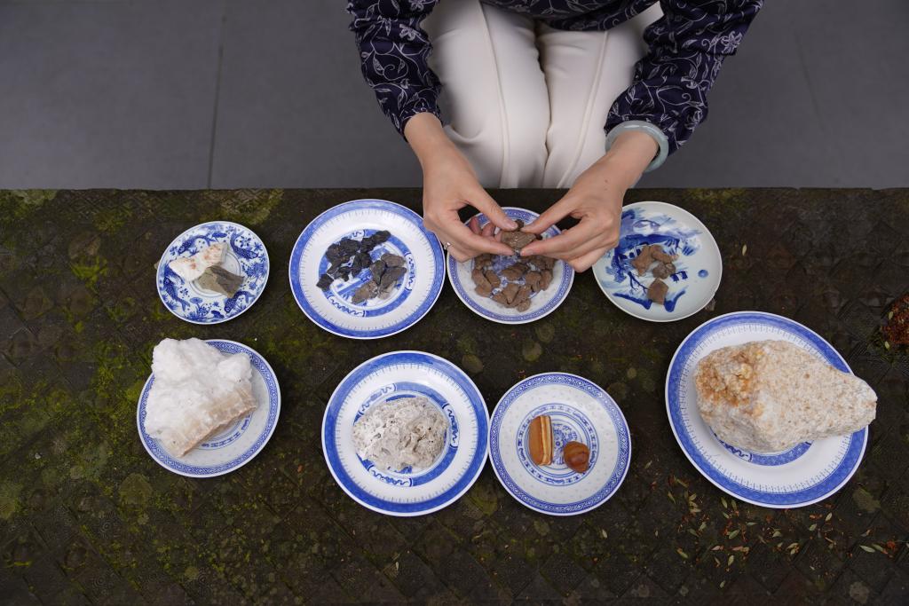2023年4月19日,在江西景德镇,蔡文娟在“青花故事”创作基地挑选原矿料。新华社记者 周密 摄