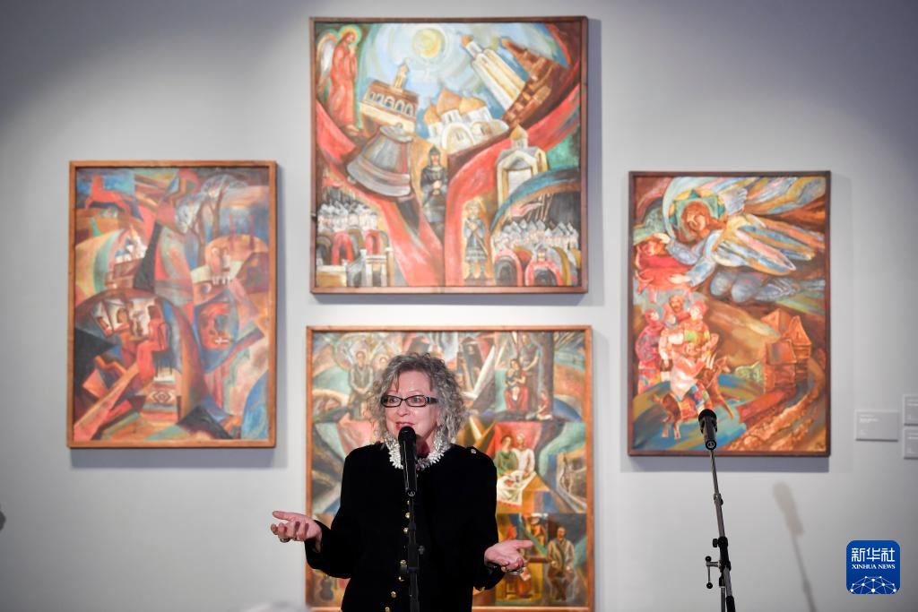 9月30日,在俄罗斯莫斯科电影制片厂画廊,伊琳娜·扎哈罗娃在“命运之织”艺术展开幕式上讲话。新华社发(亚历山大摄)