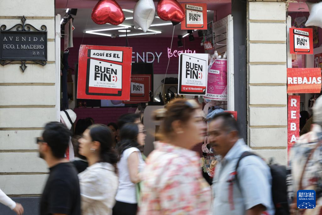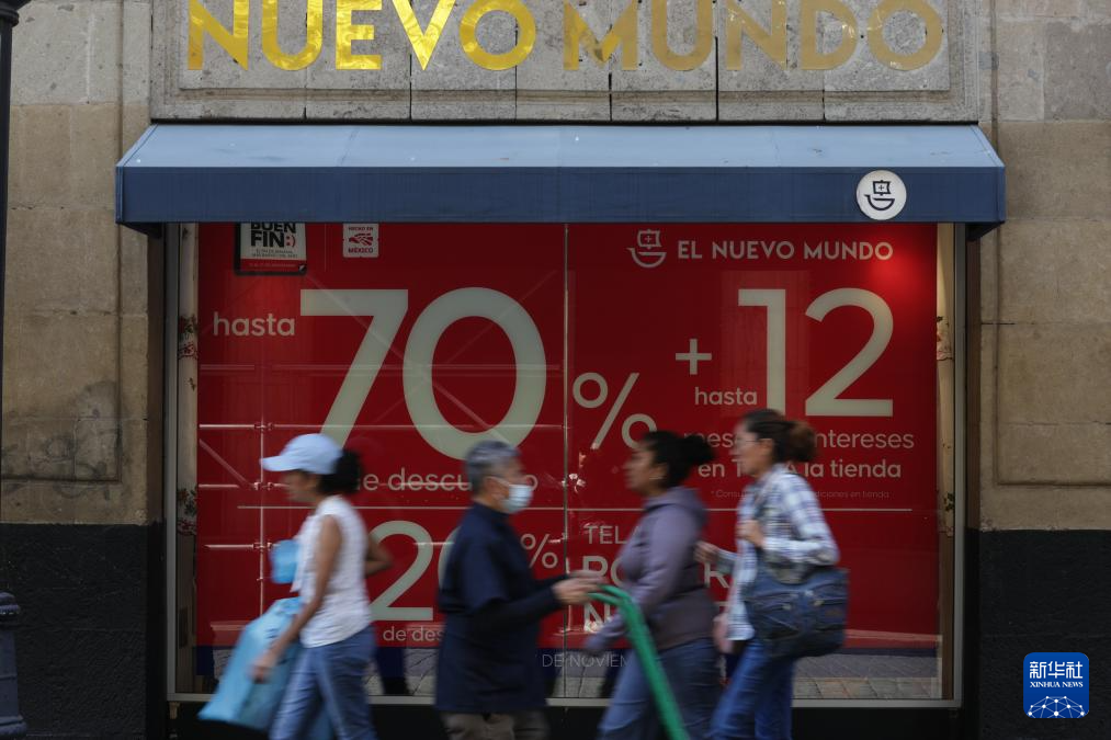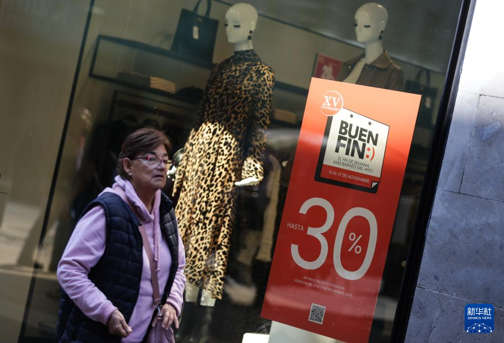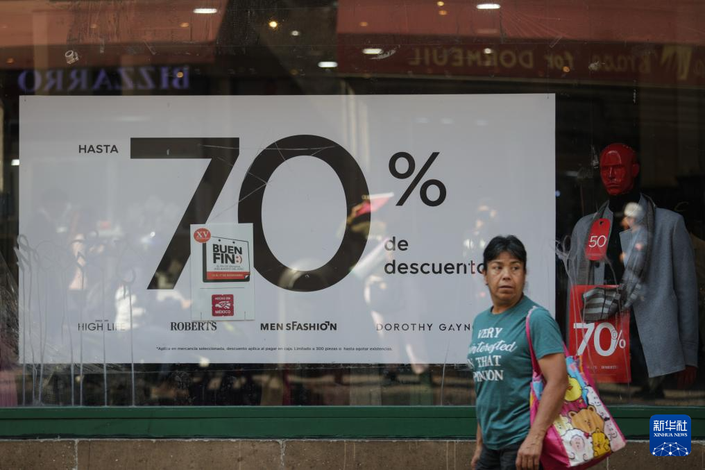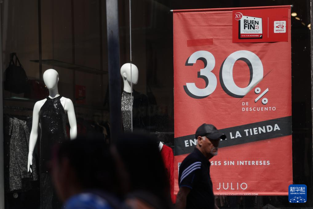 11月13日,在墨西哥首都墨西哥城,人们走过商场的打折标语。