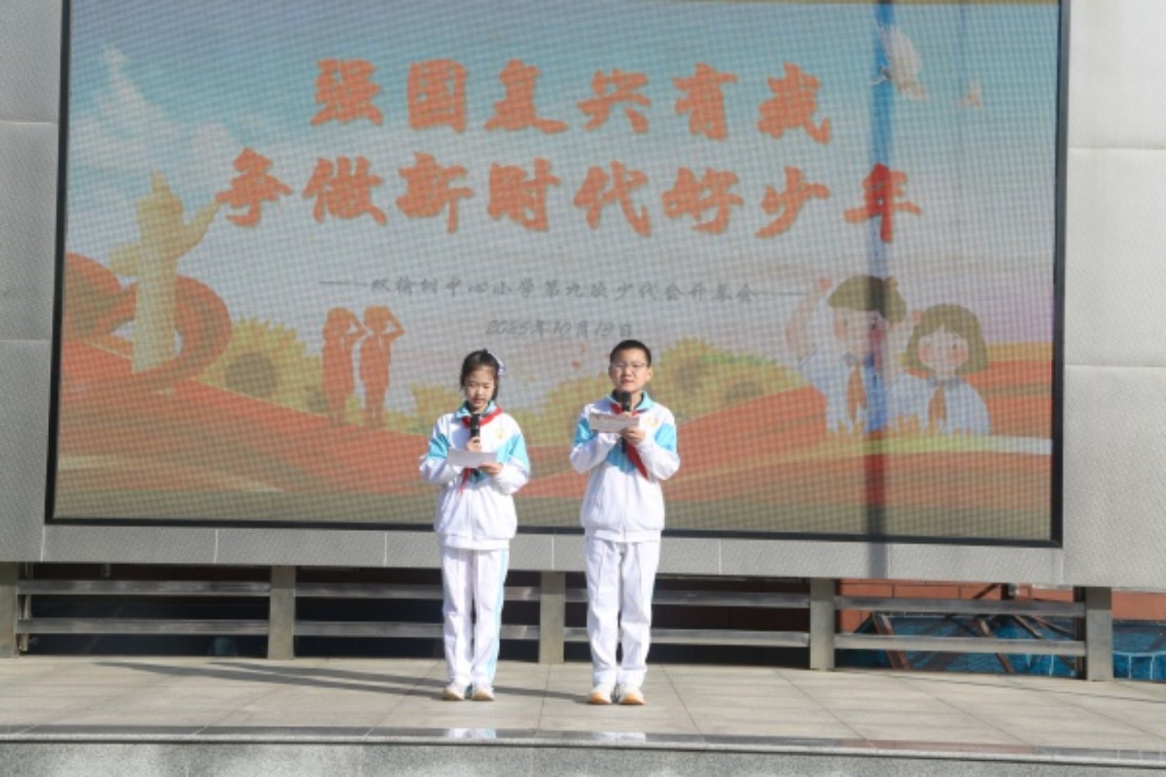 “为了祖国的强盛、民族的复兴,我们时刻准备着!”少先队员代表们登上舞台,以真挚的情感、铿锵的语言献上献词。他们的话语里,满是对祖国的热爱、对未来的向往,更有担当时代使命的坚定决心,引发了在场师生的强烈共鸣,也让“强国复兴有我”的种子在每一位少年心中深深扎根。