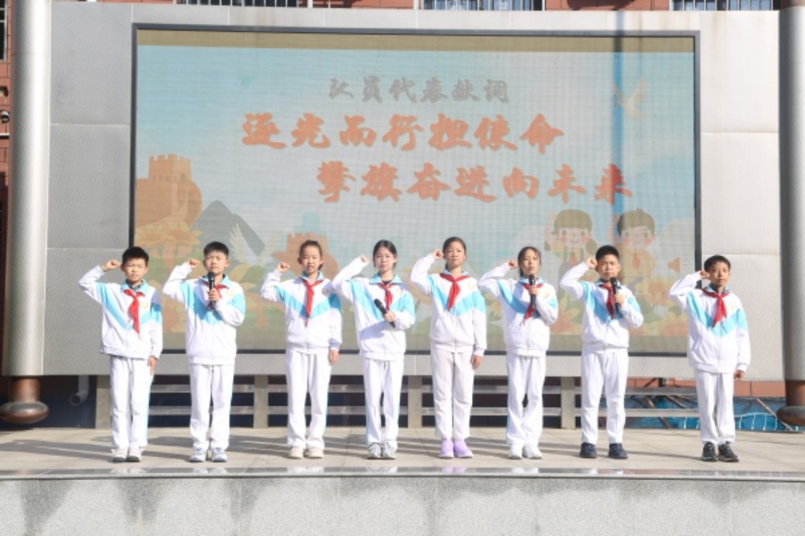 “准备着,为共产主义事业而奋斗!”“时刻准备着!”在大队辅导员王老师的带领下,全体少先队员高举右拳,庄严呼号。嘹亮的呼号声回荡在校园,是双榆少年对未来的承诺,更是对使命的担当。