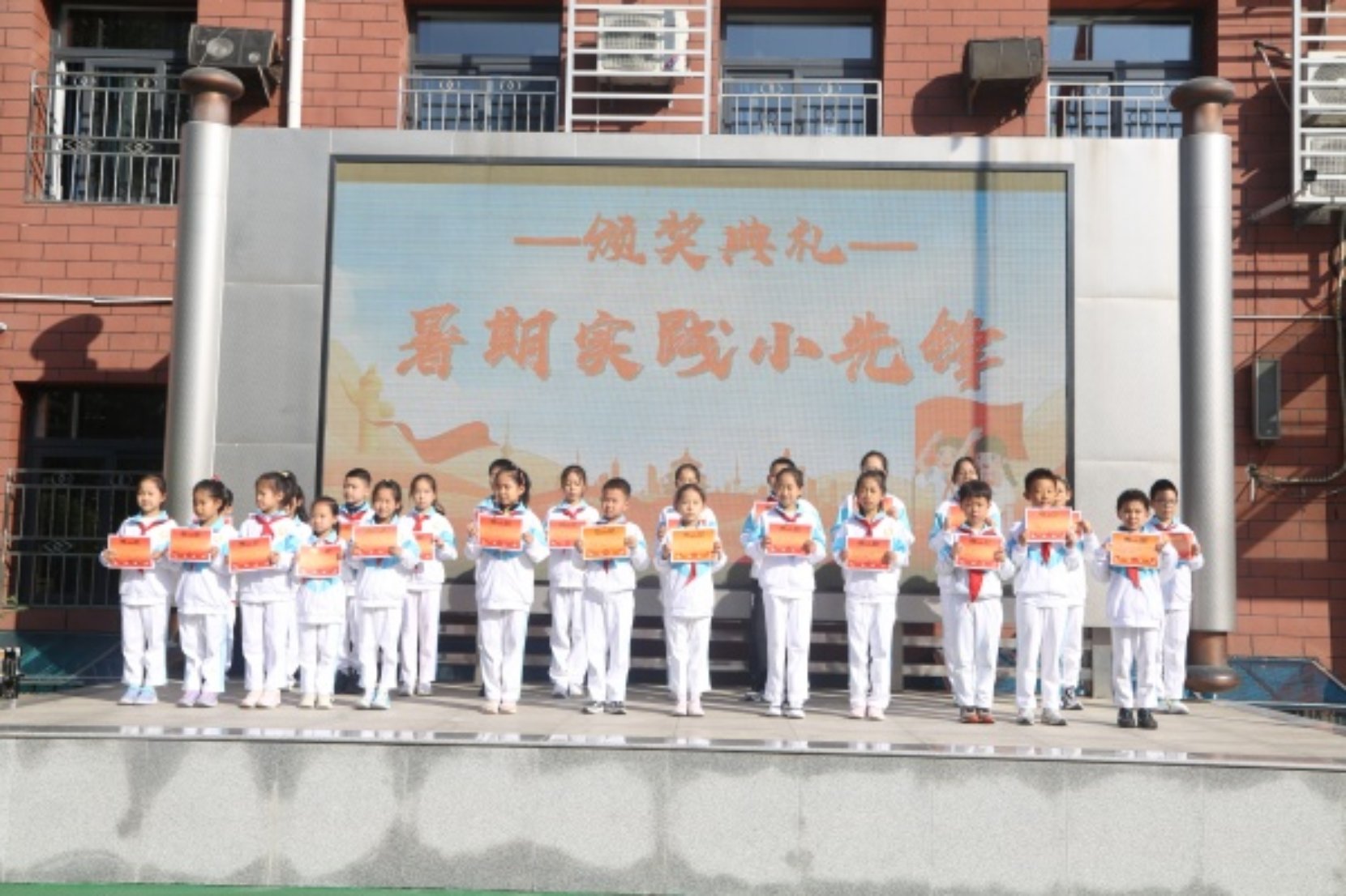 暑假期间,在学校少工委的号召下,队员们积极走出校园,参与志愿服务、探索自然奥秘、体验劳动快乐,在“强国复兴”主题实践中收获满满,也涌现出一大批优秀个人与集体。大会上,学校对450余名荣获“暑期实践小先锋”称号的队员进行表彰。随后,12个荣获“暑期实践活动优秀组织奖”的中队代表也上台领奖。学校领导为获奖个人与集体颁发荣誉证书,现场掌声雷动,既是对先进的祝贺,也是对全体队员的激励,引导大家以榜样为镜,在实践中成长,在奋斗中闪光。