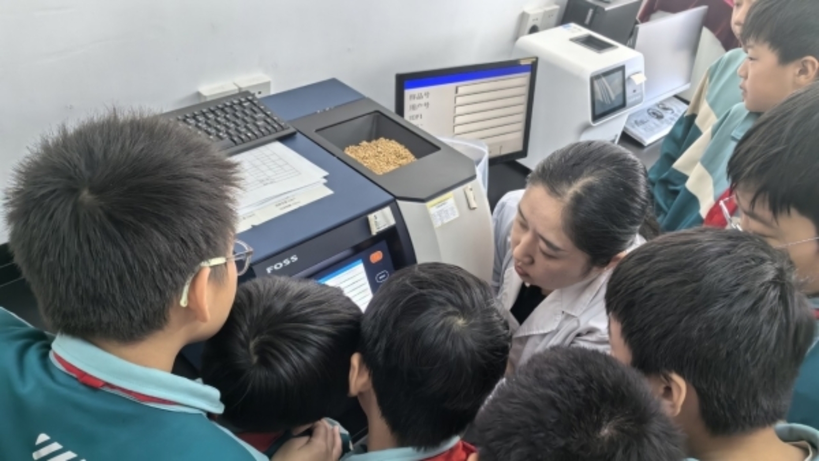 活动第一站,队员们有序踏入市粮油检测站专业实验室。检测员阿姨化身“科学向导”,现场演示如何快速分析粮食的水分、蛋白质含量。从取粮样、滴试剂到仪器读数,每一步都让队员们惊叹不已。从辨别小麦、水稻、玉米等不同谷物的外形特征,到听检测员讲解面粉从原粮到成品的加工流程,队员们认真聆听、仔细记录,时不时举手追问“面粉为什么会有不同等级”“检测不达标会怎么样”。在“淀粉遇酸碱变色”互动实验环节,队员们亲手将试剂滴入淀粉溶液,看着透明液体瞬间变成红色、蓝色,此起彼伏的“哇”声充满实验室。这场亲手操作的小实验不仅让大家直观感受到科学的奇妙,更在队员们心中悄悄播下了“用科学守护粮食安全”的种子。