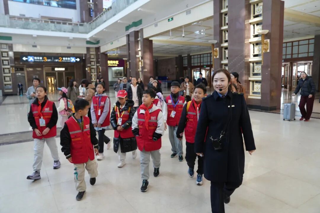 在靖喆姐姐的引导下,小记者们一路看一路学,仿佛坐上了一列“时光列车”。从站史馆里的旧车票、老照片,到中央大厅35米跨度的“双曲扁壳”穹顶;从自助取票厅里的自助化设备,到候车室的智能充电座椅;从为旅客提供暖心服务的“京铁爱心”服务组,到站内充满人文关怀的“乘务员之家”“保洁员之家”……小记者们不仅看到了北京站的厚重历史,更感受到了祖国日新月异的发展。